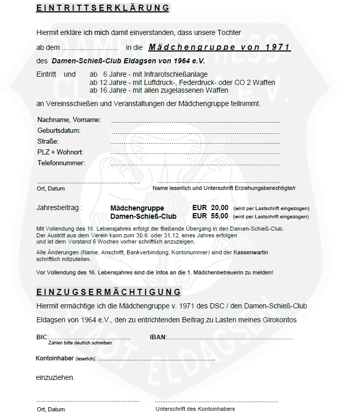 Eintrittserklärung Jugend und Damenklasse (> 16 Jahre) Download Eintrittserklärung Damen als PDF Eintrittserklärung Mädchengruppe (< 16 Jahre) Download Eintrittserklärung Mädchengruppe als PDF FolgenFolgen Suche nach: Neueste Beiträge Seniorinnenpokal Vorstandspokal 2025 Hagemann-Pokal 2025 Tegtmeyer-Fischer-Pokal 2025 Königinnenpokale 2025